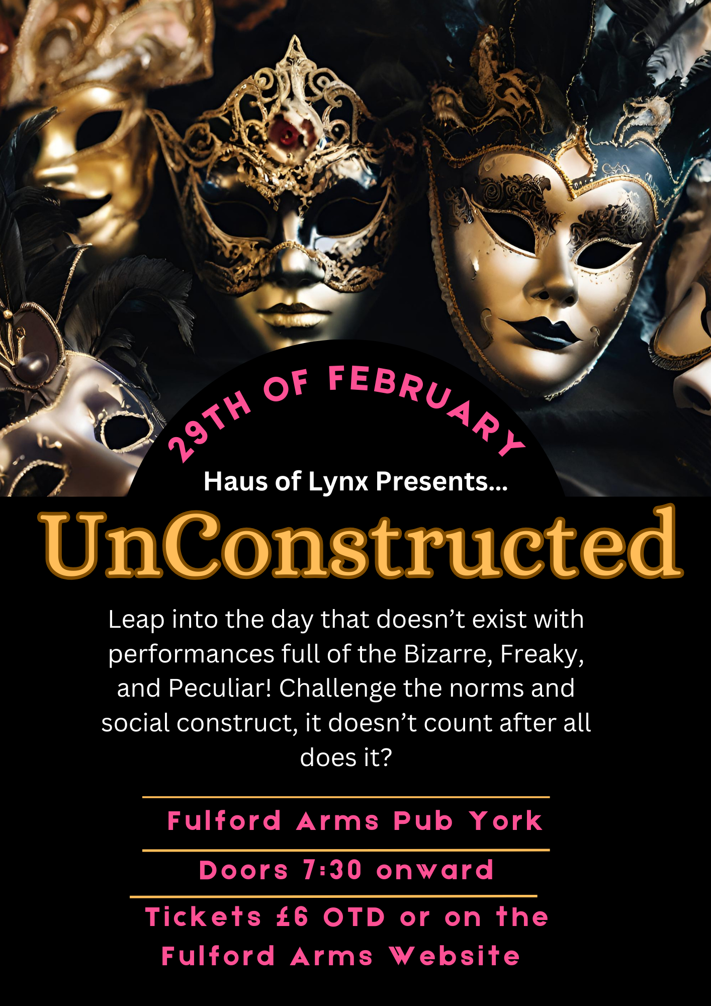 Come one, come all to partake in festivities upon the day that doesn’t exist! It is once every 4 years, and so we must make it count! Challenge the construct of “normal” thrust upon us on this most questionable day of the year! Prepare thyselves for not only for wonderfully weird and wacky acts, but for a night of sheer chaos beyond the imagination! Celebrate and Unconstruct it all with us, we look forward to seeing you!
