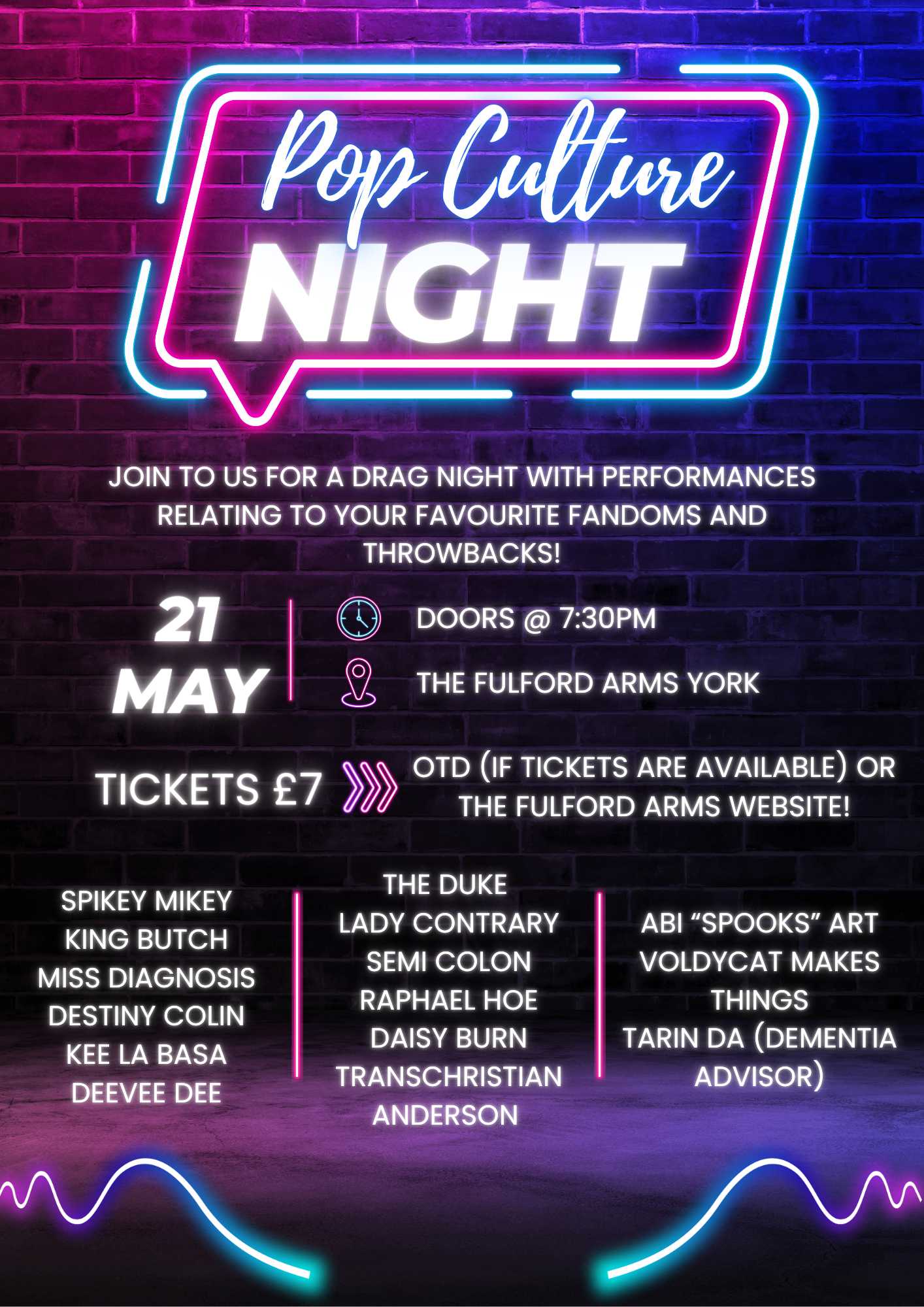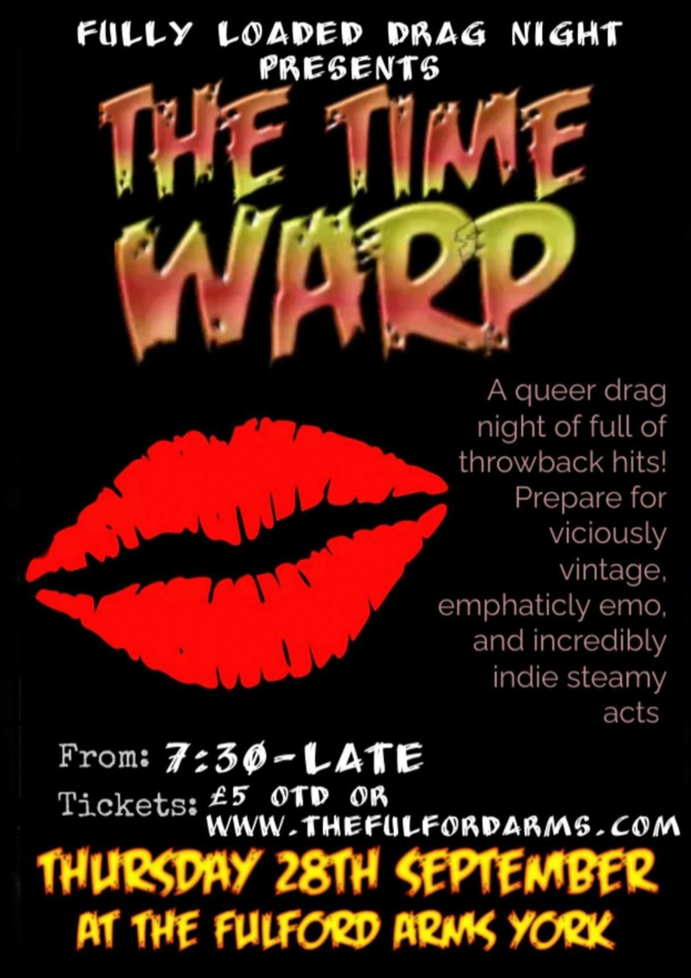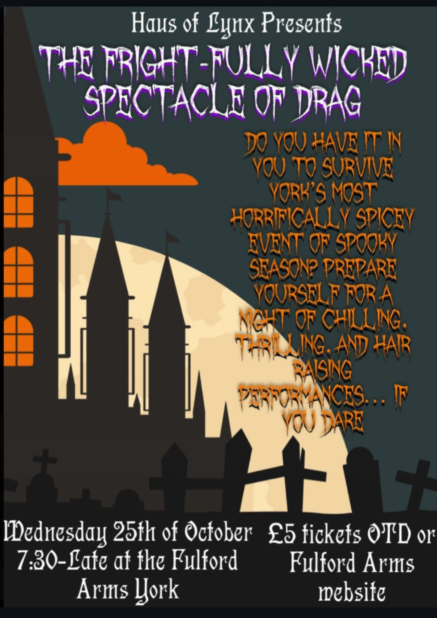 Spooky season has begun! Join us at The Fulford Arms from 7:30pm for a hauntingly steamy queer drag night. Don’t worry, we don’t bite (unless you say please). Bring your fellow victims- I mean friends, and we assure it will be a night you won’t forget! We will get you to believe things unfathomable to any common mind. No tricks just treats! -