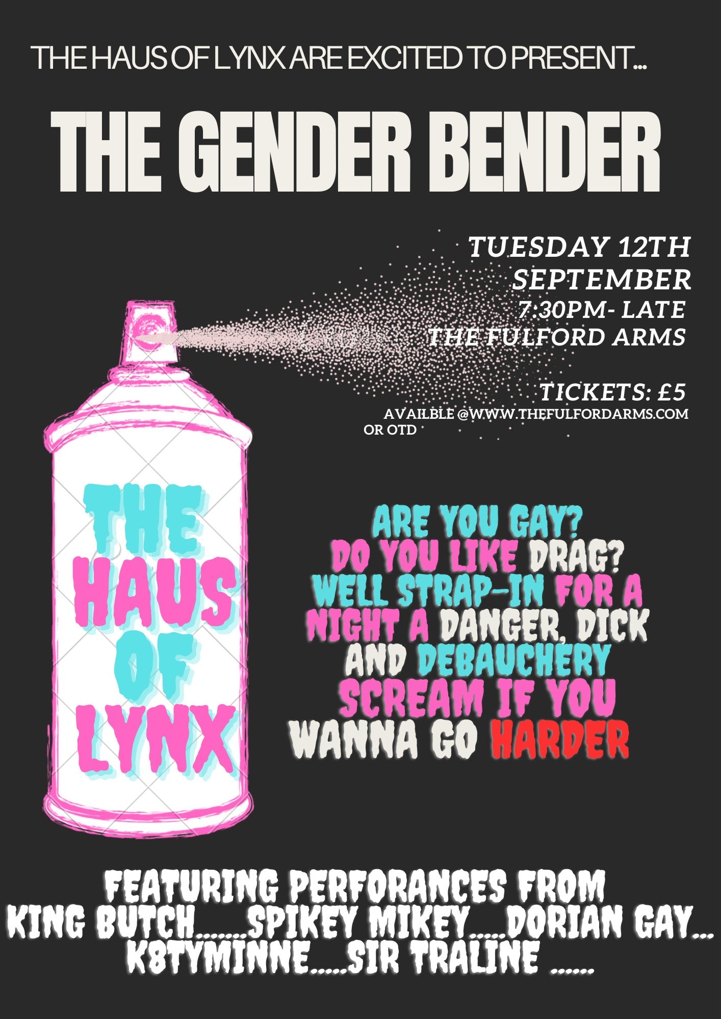 Oh my… danger? Dick? And debachery? 🥵Yes please! Come and join us for the first Haus of Lynx show at the Fulford Arms!!!!