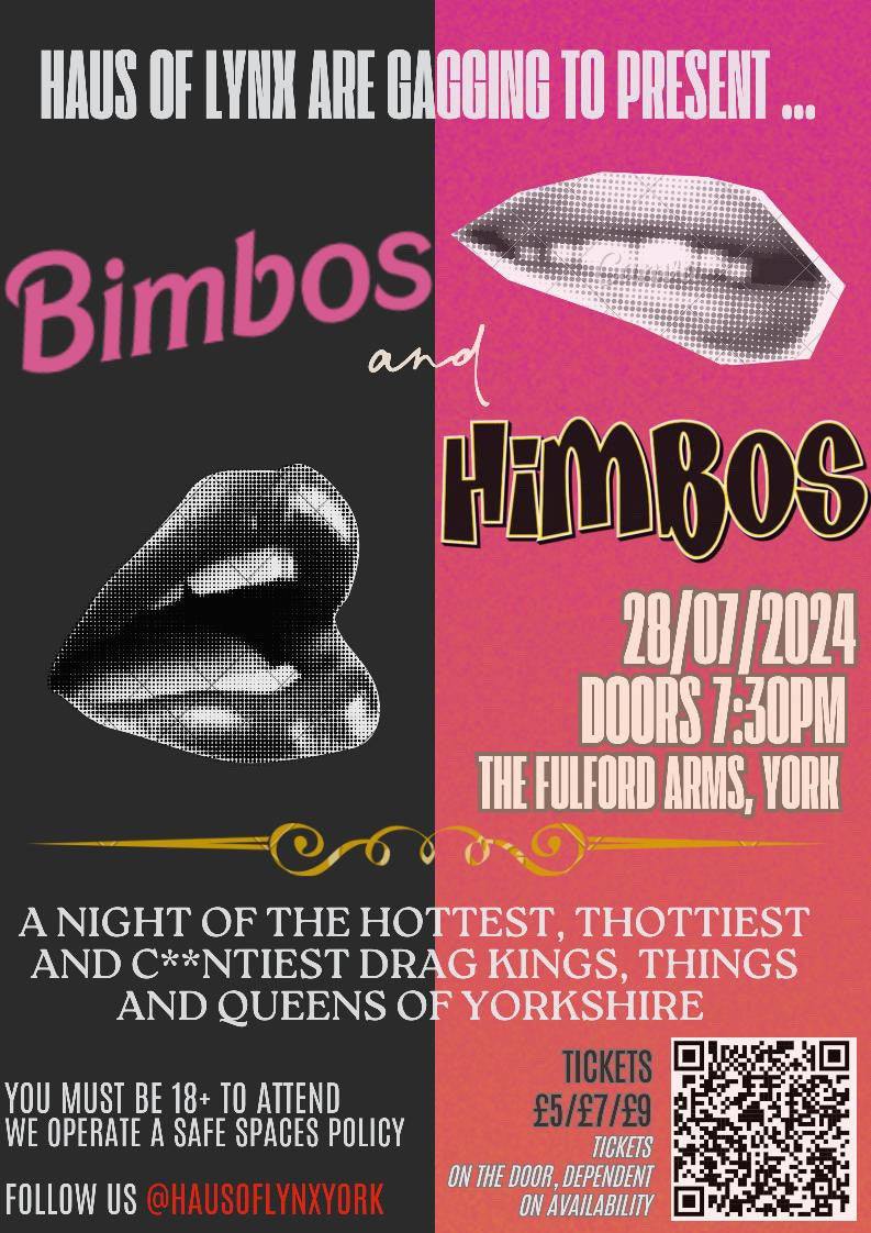 Haus of Lynx are absolutely GAGGING to present their next night...BIMBOS AND HIMBOS 👄👄👄👀 Prepare for a night of the hottest, thottiest and c**ntiest drag kings, things and queens of Yorkshire! Featuring local legends including Victoria Peaches, Xero Phucse and many more, hosted by your Haus Daddies King Butch and Spikeyy Mikeyy!
